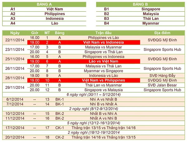 Pháp luật Online gửi tới người hâm mộ bóng đá Việt Nam lịch thi đấu tại AFF Suzuki Cup2014.