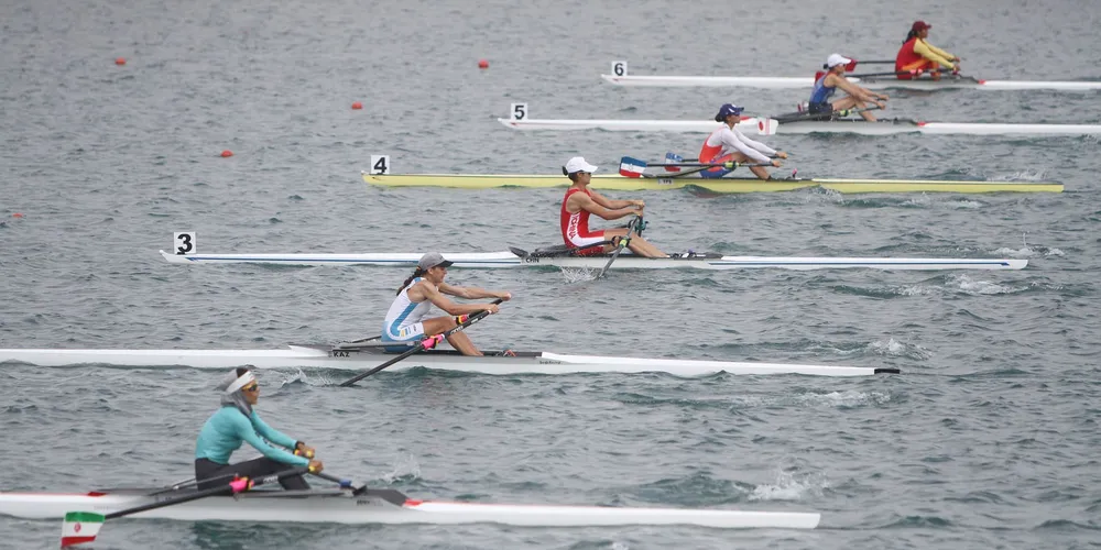 ...Nguyễn Thị Giang (số 6) dự tranh chung kết mái chèo đôi đơn nữ. ẢNH: PHẠM HUY