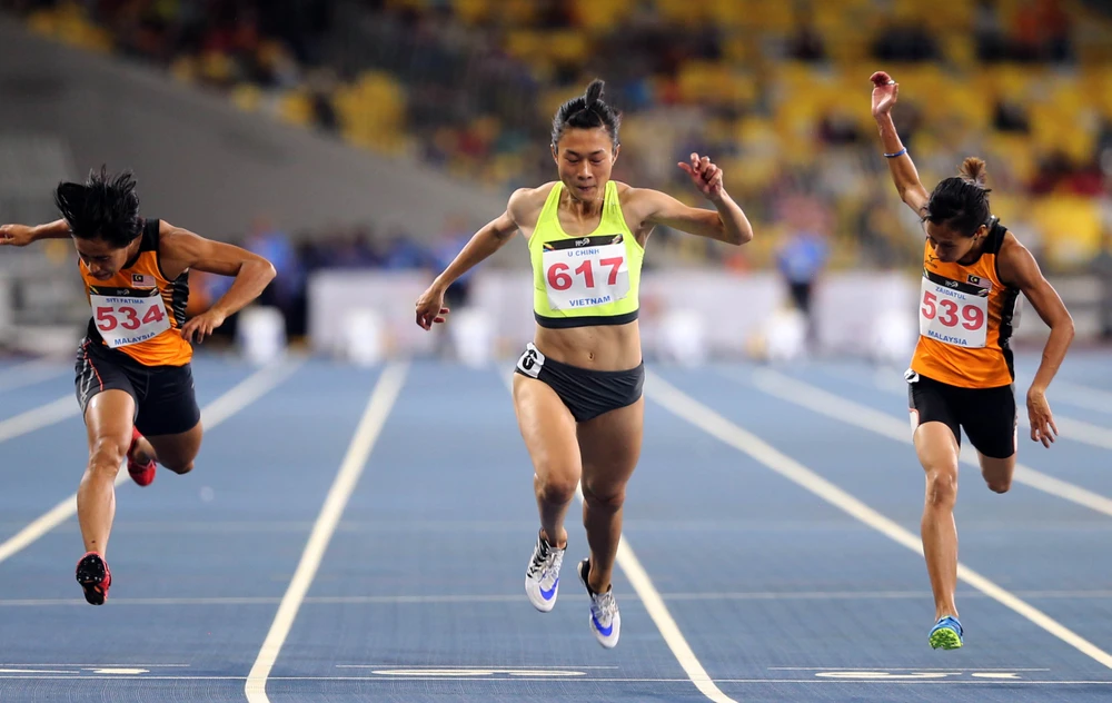 Lê Tú Chinh dự tranh vòng loại cự ly 100 m nữ. Ảnh: PHẠM HUY