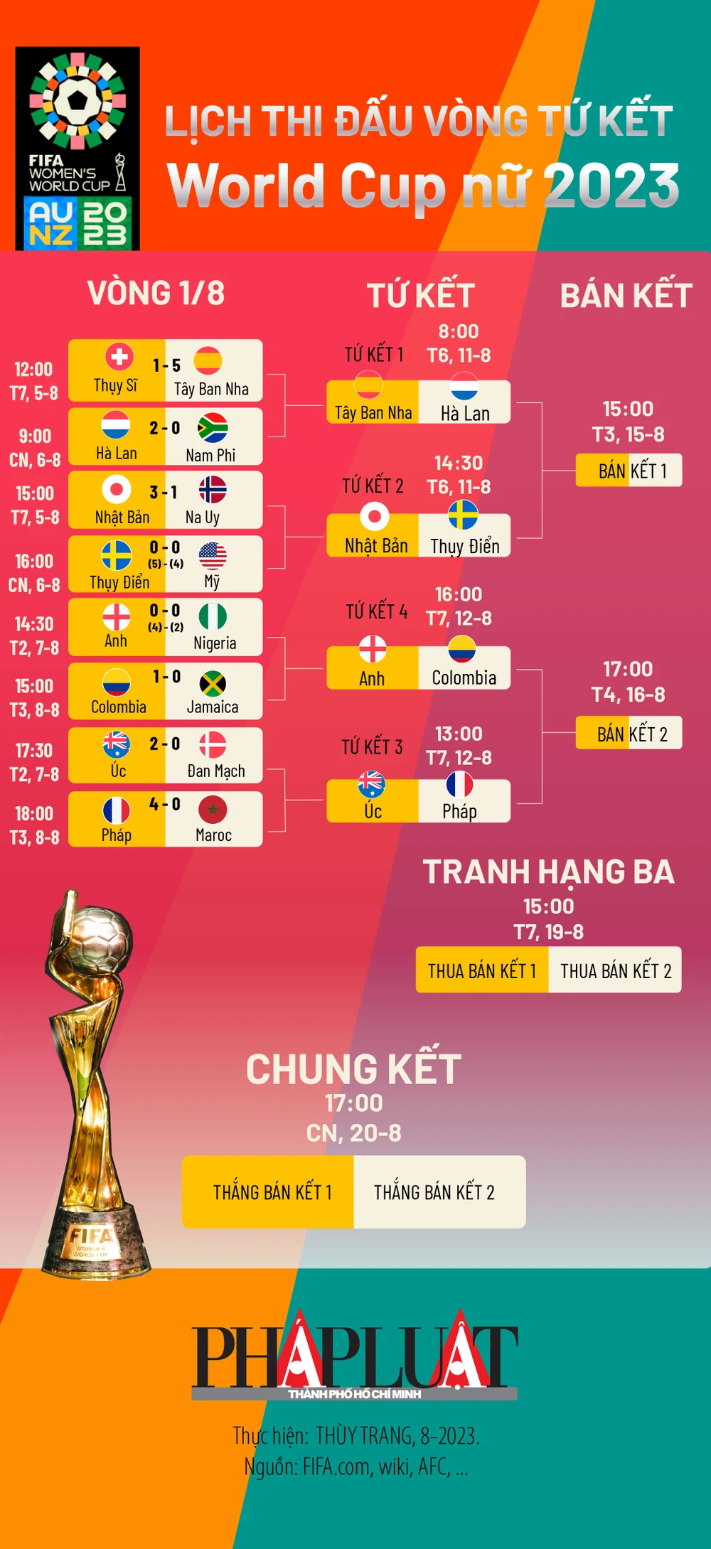 (PLO)- Lịch thi đấu World Cup 2023 bóng đá nữ từ vòng tứ kết.