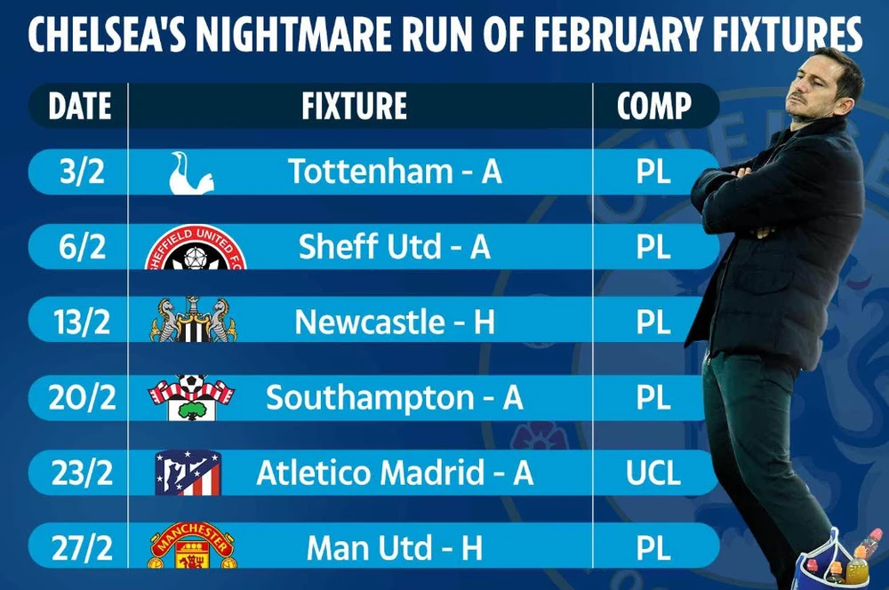 Lịch thi đấu khó khăn của Chelsea trong tháng 2-2021. ẢNH: THE SUN