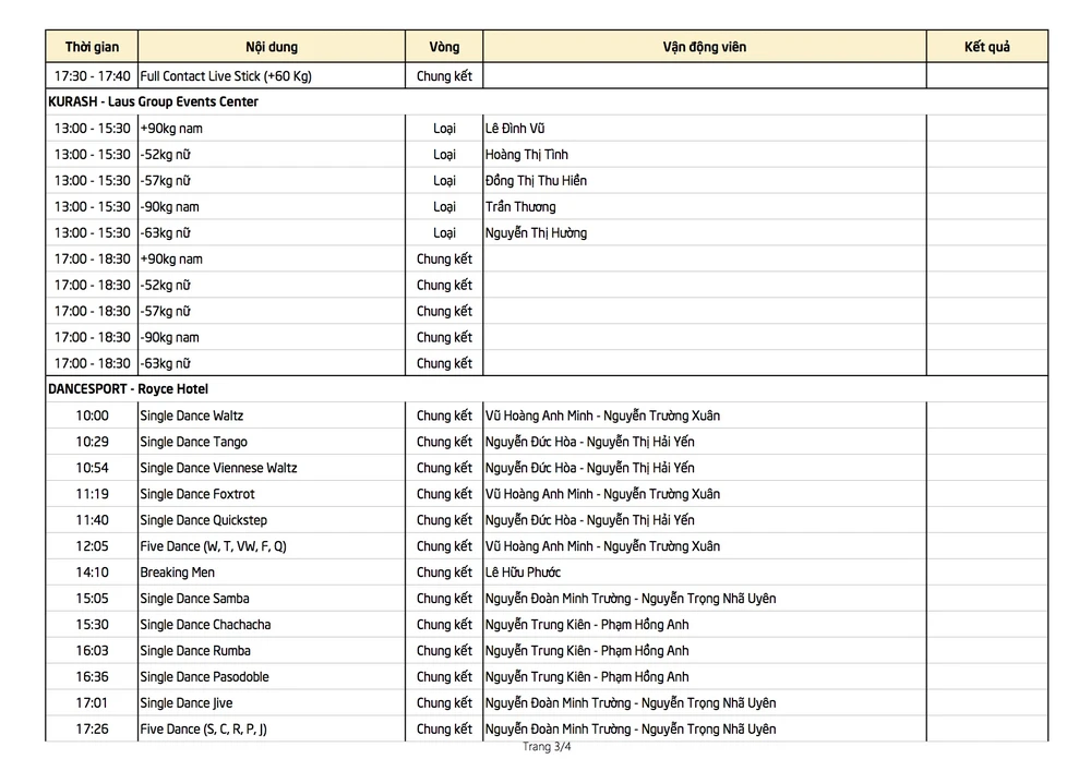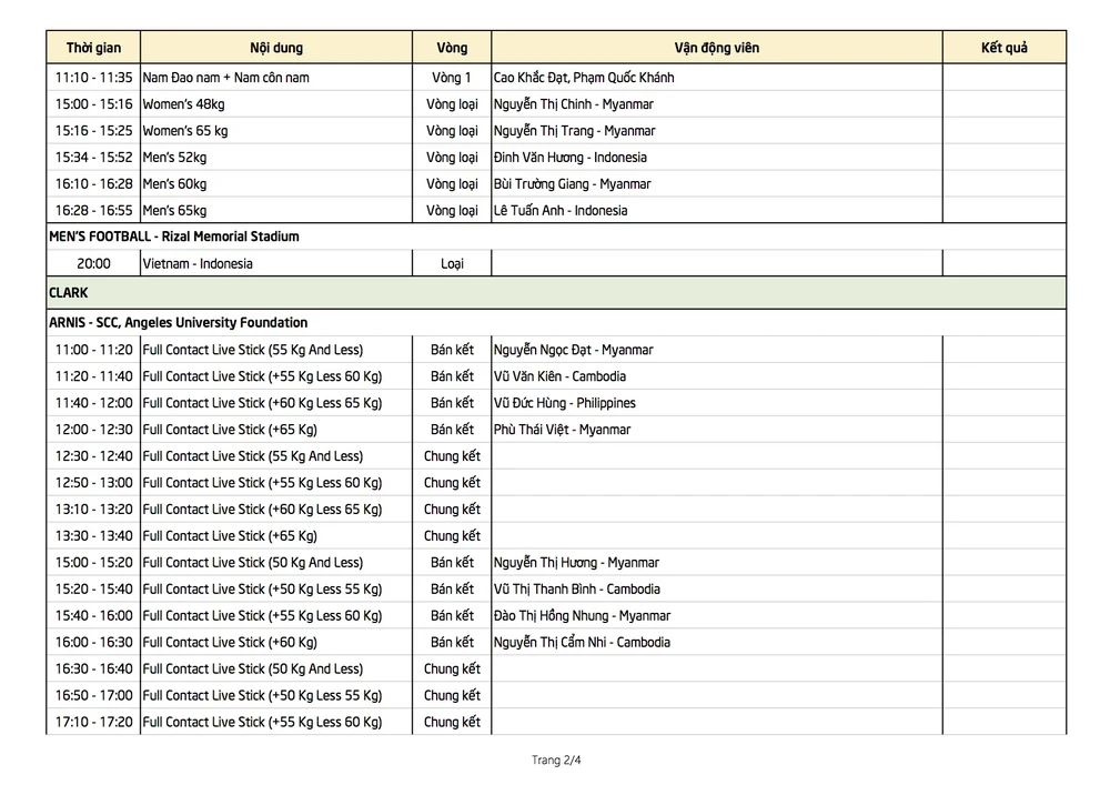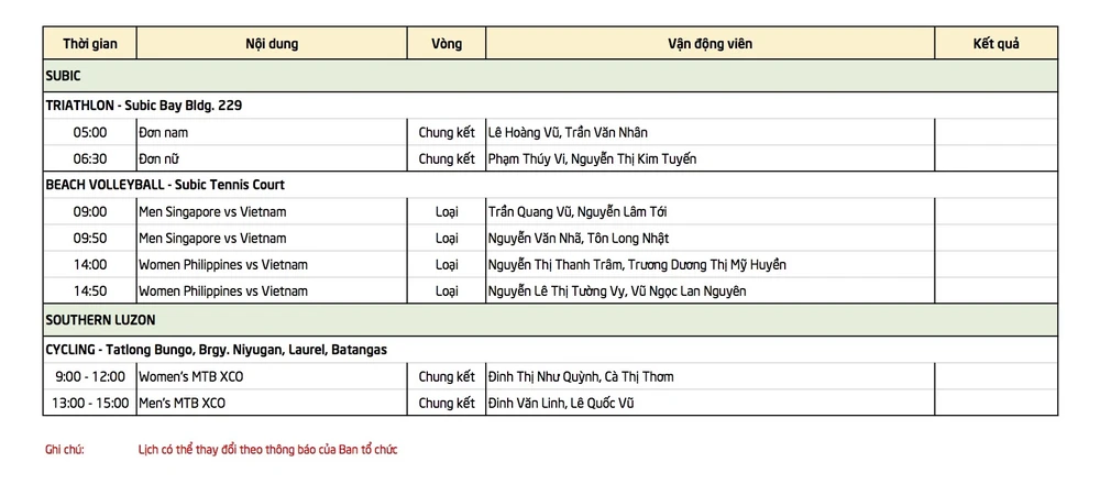 Lịch thi đấu này 1-12 của đoàn Thể thao Việt Nam (giờ Philippines sớm hơn giờ Việt Nam 1 tiếng)