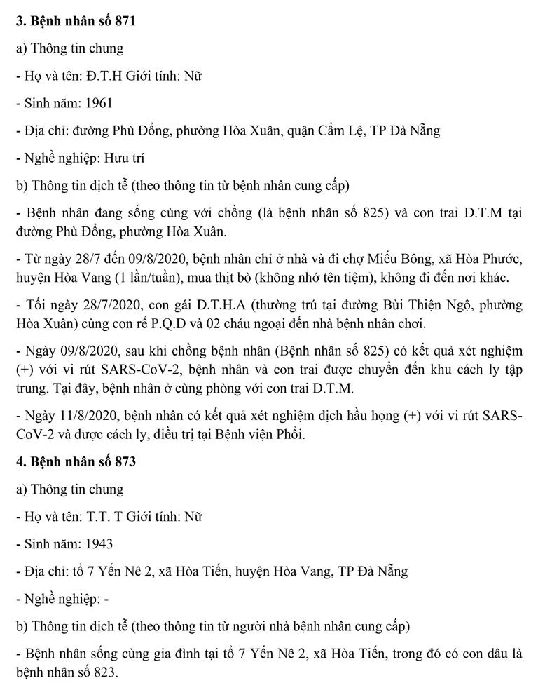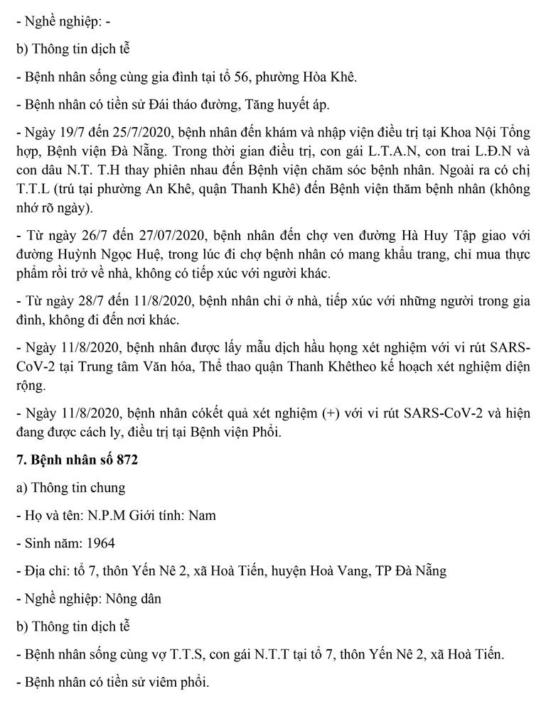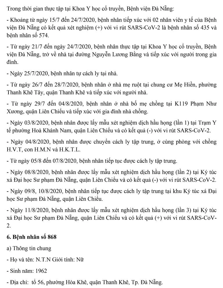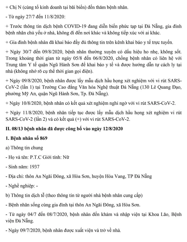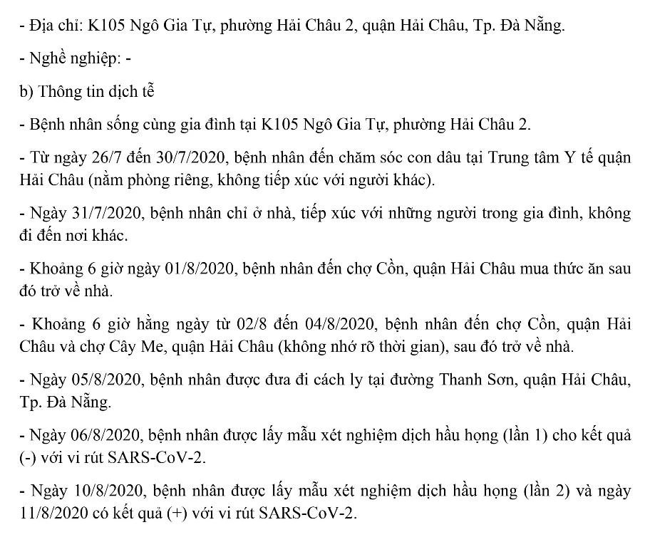 Tối 12-8, Ban chỉ đạo Phòng chống dịch COVID-19 TP Đà Nẵng cung cấp thông tin về kết quả điều tra, giám sát, xử lý đối với một trường hợp bệnh nhân còn lại mắc COVID-19 tại TP. Trường hợp này được công bố ngày 11-8 và 8/13 trường hợp bệnh nhân được công bố trong ngày 12-8.
