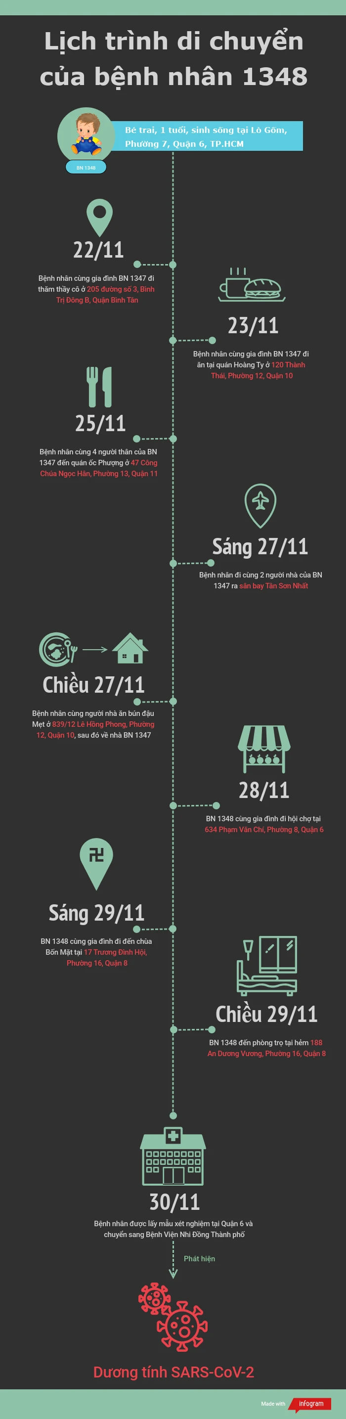 (PLO)- BN 1348 (1 tuổi) được phát hiện dương tính với virus SARS-CoV-2 vào 18g ngày 30-11. Hiện BN đang được cách ly điều trị tại BV Nhi đồng TP. Truy vết cho thấy, BN đã tiếp xúc gần bệnh nhân BN 1347 và đến nhiều nơi như nhà hàng, hội chợ, sân bay.
