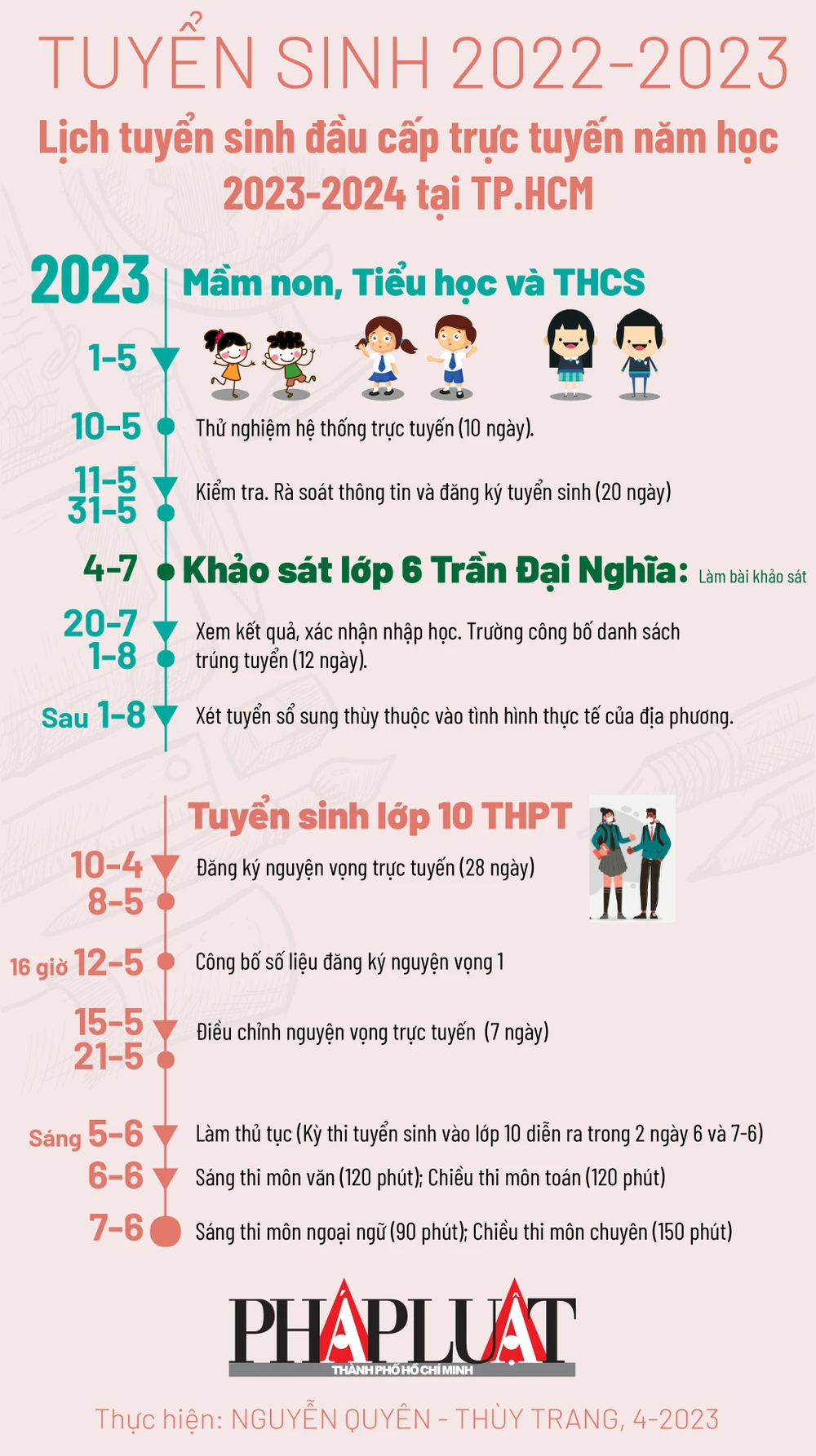 (PLO)-  Lịch tuyển sinh đầu cấp trực tuyến năm học 2023-2024 của các khối Mầm non, Tiểu học, THCS,  THPT tại TP.HCM như sau.