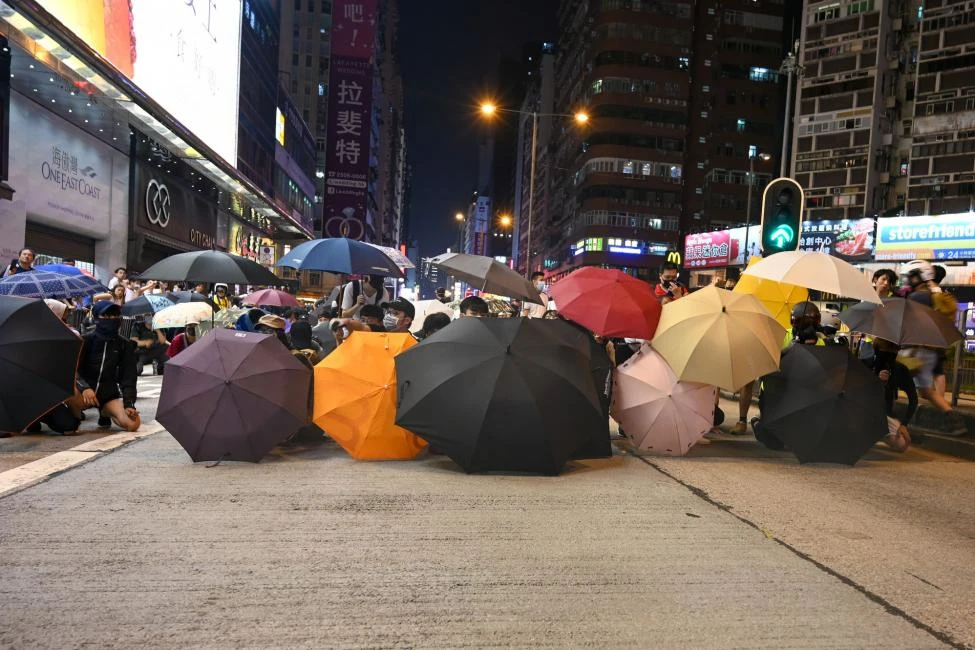Người biểu tình Hong Kong trốn sau những chiếc ô khi biểu tình biến thành bạo lực hôm 7-9. Ảnh: UPI