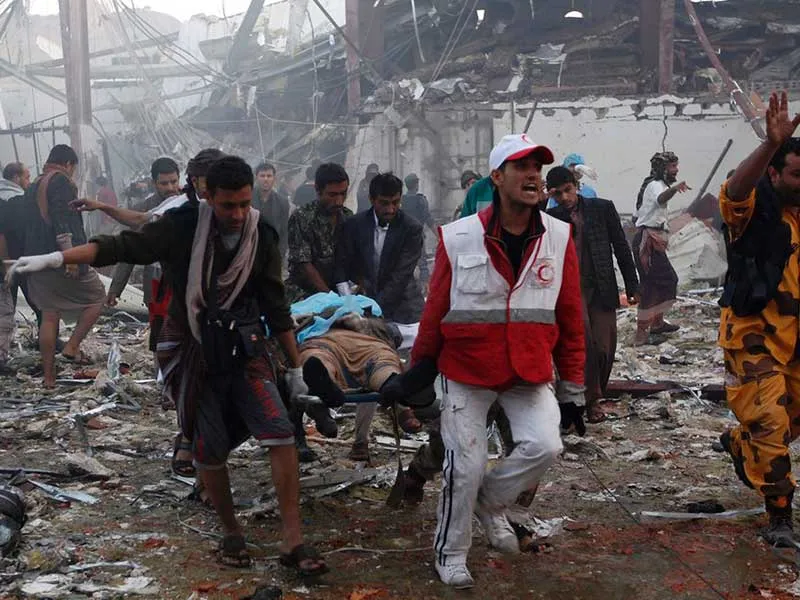 Nhà điều phối nhân đạo của LHQ tại Yemen Jamie McGoldrick cho biết có hơn 140 người thiệt mạng và 525 người bị thương (ảnh) trong vụ không kích. Đài truyền hình Al-Masirah đưa tin trong số người chết có đô trưởng Abdel Qader Hilal. Các nhân chứng cho biết máy bay đã bắn một quả tên lửa vào địa điểm lễ tang. Sau đó máy bay thứ hai bắt đầu ném bom.