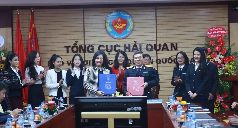 Bà Nguyễn Thu Hoa, Phó TGĐ LienVietPostBank và ông Nguyễn Danh Thái, Phó Tổng cục trưởng Tổng cục Hải quan tham gia ký kết thỏa thuận hợp tác