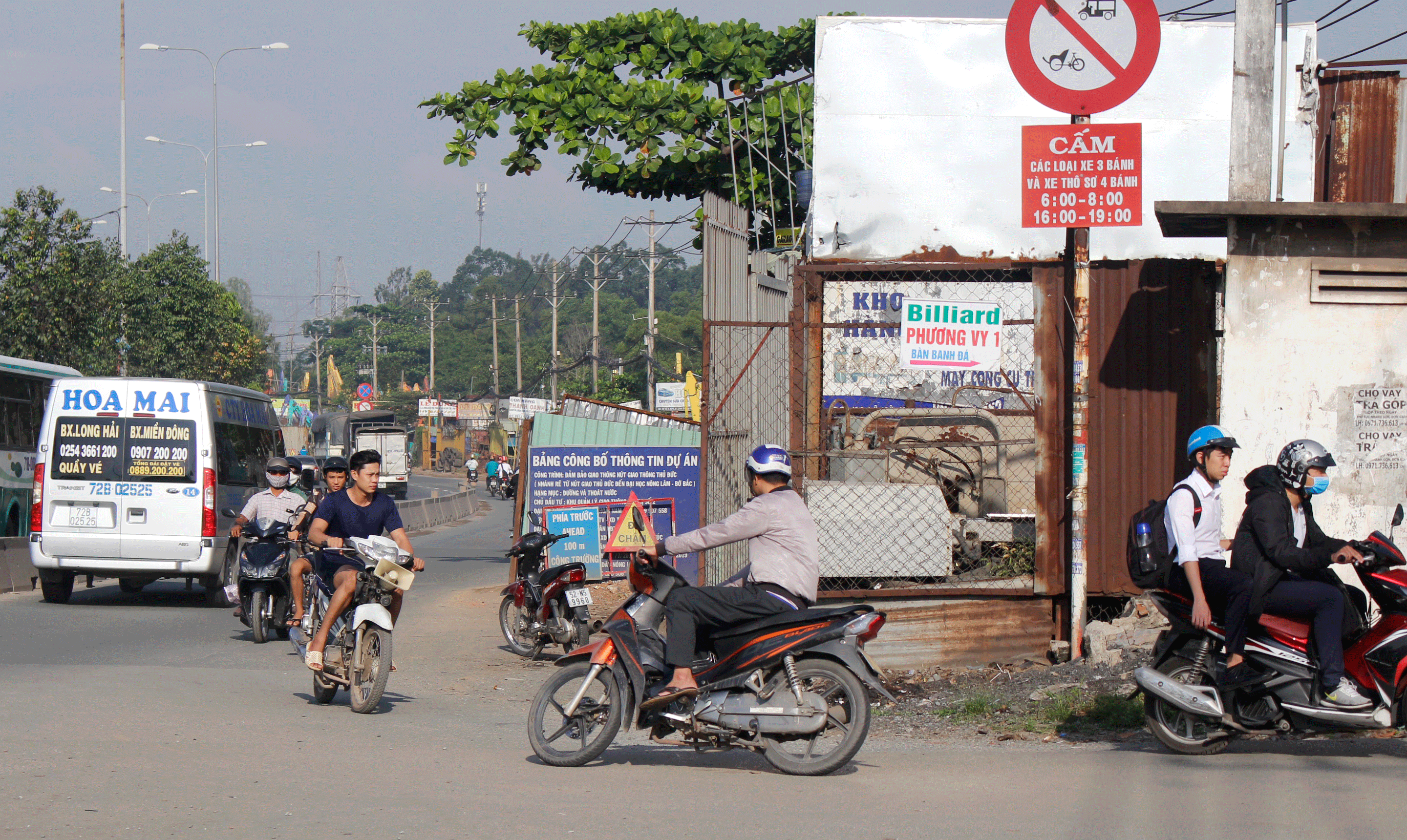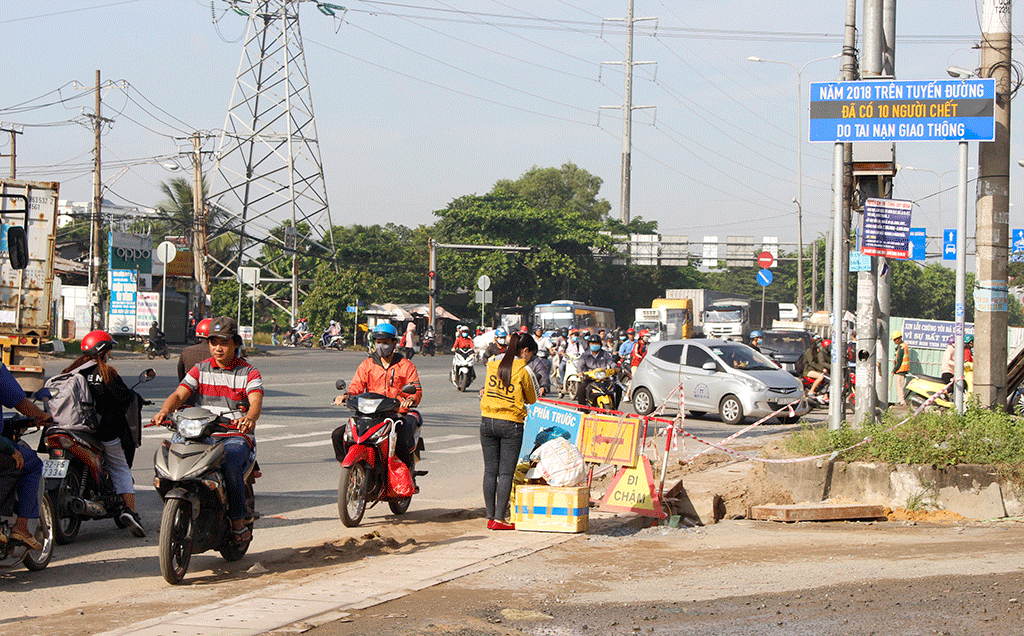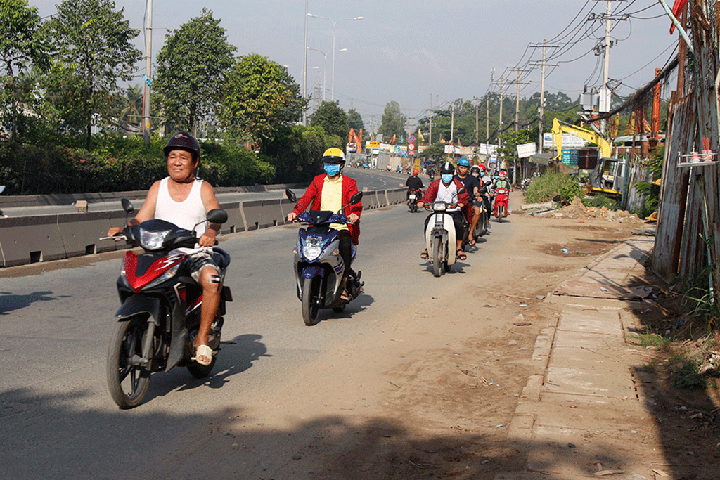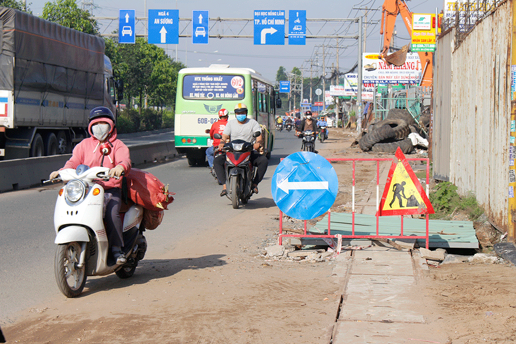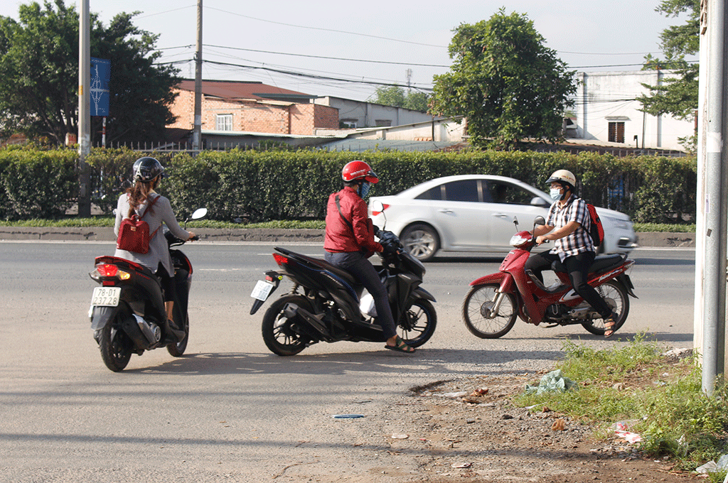 Đoạn quốc lộ 1A từ cổng Trường ĐH Nông Lâm TP.HCM đến đường dẫn vào ĐH Quốc gia TP.HCM, tình trạng hàng loạt người điều khiển xe máy, xe ba bánh chạy ngược chiều nối dài, tiềm ẩn tai nạn giao thông.