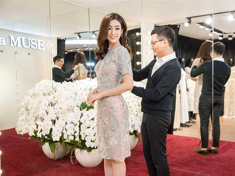 Hoa hậu Đỗ Mỹ Linh thử trang phục của nhà thiết kế Tùng Vũ để dự thi Miss World 2017. (Ảnh do Sen Vàng cung cấp)