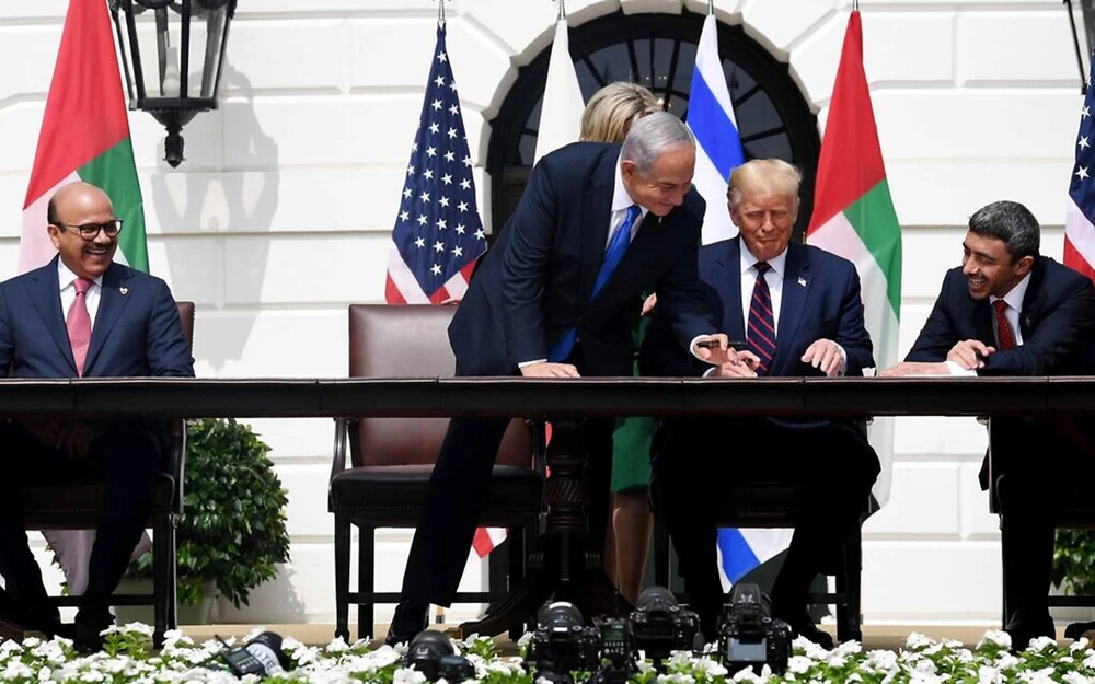 Từ trái qua: Ngoại trưởng Bahrain Khalid bin Ahmed Al Khalifa, Thủ tướng Israel Benjamin Netanyahu, Tổng thống Mỹ Donald Trump, Ngoại trưởng UAE Abdullah bin Zayed al-Nahyan tại buổi lễ ký Hiệp định Abraham bình thường hóa quan hệ giữa Israel và các nước Ả Rập ngày 15-9. Ảnh: TIMES OF ISRAEL