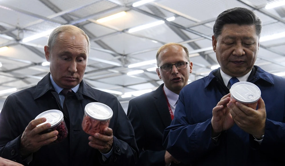 Tổng thống Nga Vladimir Putin (trái) và Chủ tịch Trung Quốc Tập Cận Bình (phải) thăm gian hàng nông sản tại Triển lãm Đường phố Viễn Đông (Nga) năm 2018. Ảnh: AP