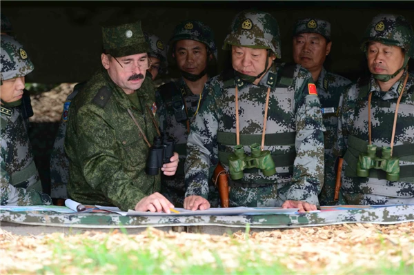 Sĩ quan quân sự Nga và Trung Quốc chỉ huy lực lượng của họ trong cuộc tập trận bắn đạn thật chung tại thao trường Chebarkul ở Chelyabinsk (Nga) năm 2013. Ảnh: Tan Changjun / TÂN HOA XÃ