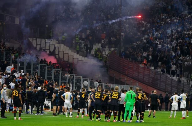 Vào rạng sáng thứ sáu tuần trước, trận đấu giữa Marseille và Galatasaray ở Europa League phải tạm dừng do các CĐV ném pháo sáng vào nhau khiến cảnh sát chống bạo động phải lên các khán đài dẹp loạn.