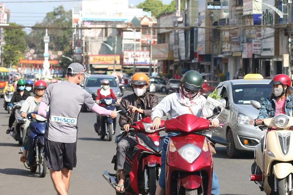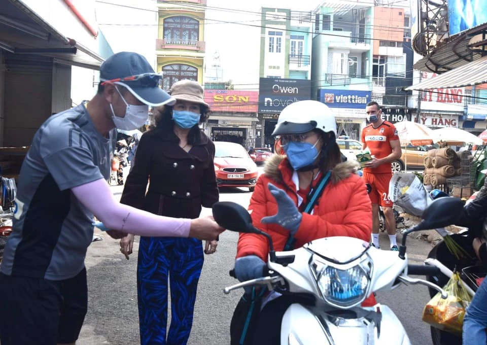 HLV Lee Tae-hoon phát khẩu trang cho khách bộ hành ở thành phố Pleiku.