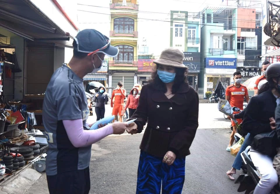 Minh Vương và đồng đội tặng miễn phí cho mỗi người 3 chiếc khẩu trang trên vỉa hè...