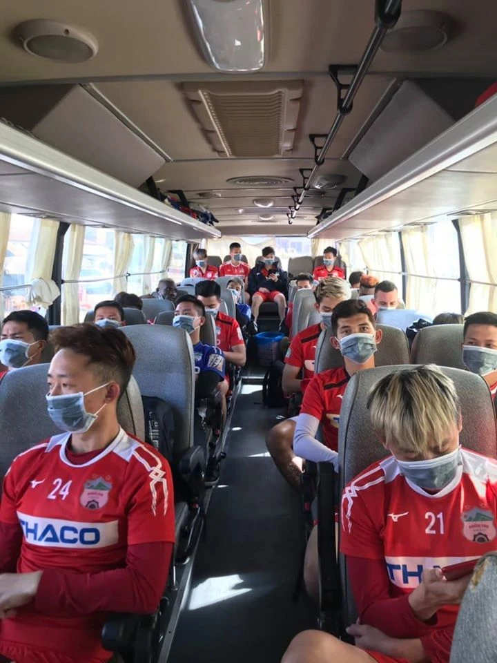 Cả đội HA Gia Lai đều bịt kín khẩu trang trên đường ra sân tập để ngăn ngừa dịch Corona.