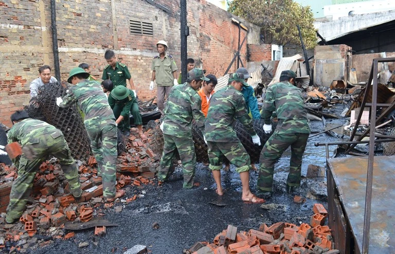 CBCS đồn biên phòng và các lực lượng của thị trấn Sông Đốc tham gia khắc phục hậu quả.