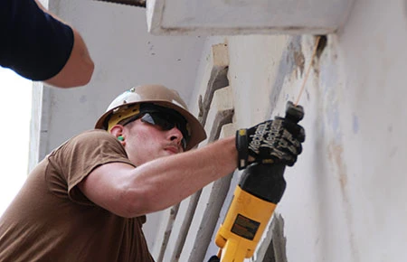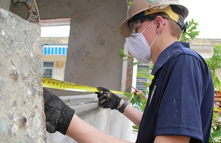 Lính hải quân Mỹ đo vẽ rất cẩn thận trước khi tiến hành tô trát, nâng cấp Trạm Y tế phường Hòa Quý. Ảnh trong bài: LÊ PHI