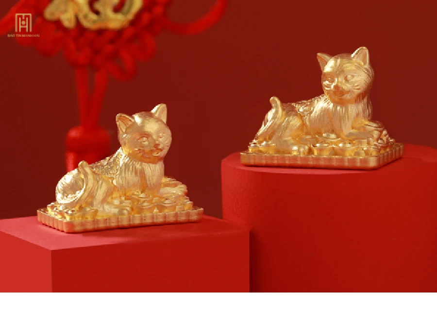 Trong số đó, tác phẩm mèo bằng vàng có trọng lượng 48 kg, tương đương 1279,968 lượng vàng. Tượng mèo vàng có tên gọi " Kim Mão Vương Bảo" của DOJI đang được trưng bày tại tầng 5 tòa nhà DOJI Tower, 5 Lê Duẩn, Hà Nội.
