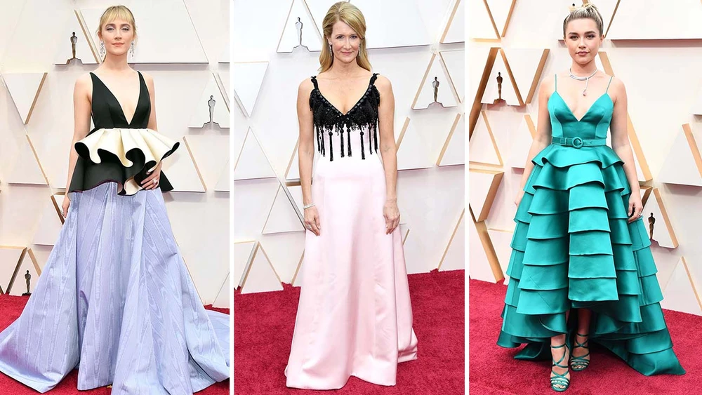 Thảm đỏ Oscar 2020 quy tụ hàng trăm minh tinh, tài tử. Trong đó, “binh đoàn” Little Women nổi bật với những bộ cánh lộng lẫy hút mắt. Nữ chính - Saoirse Ronan - đầy kiêu sa với thiết kế xếp tầng màu đen kết hợp với sắc hoa oải hương của nhà mốt Gucci.
