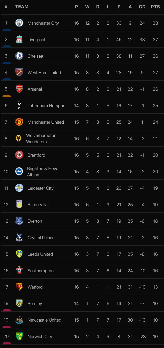 Cũng như Liverpool, ở trận cùng giờ, Chelsea ngược dòng thắng khó Leeds United 3-2 nhờ pha lập công quyết định ở phút bù giờ trên chấm 11m của Jorginho. The Blues có được vị trí thứ ba với 36 điểm. Trong khi đó, Arsenal cũng thắng Southampton 3-0 để tạm vươn lên vị trí thứ 5 với 26 điểm.