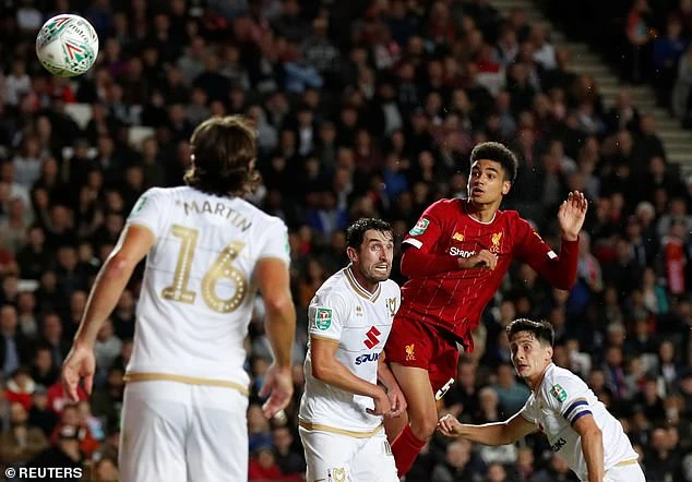 Hậu vệ trẻ Ki-Jana Hoever đánh đầu ghi bàn ấn định chiến thắng 2-0 cho Liverpool trước MK Dons.