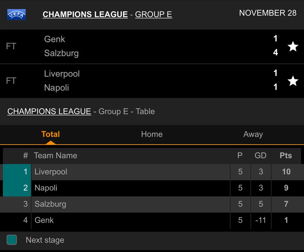 Những phút còn lại, Liverpool càng đẩy cao đội hình để tìm chiến thắng. Napoli thì chơi chậm rãi để bảo toàn tỉ số hòa trên sân Anfield. Sau 90 phút thi đấu, Liverpool và Napoli hòa nhau với tỉ số 1-1. Với kết quả này, Liverpool có được ngôi đầu bảng E với 10 điểm, Napoli đứng nhì bảng với 9 điểm. Với điểm số trên Liverpool và Napoli chưa đội nào chắc suất đi tiếp, bởi phía sau Salzburg đang tiếp tục đeo bám với 7 điểm có được. Ở trận đấu còn lại của bảng E, Salzburg thắng Genk với tỉ số 4-1.