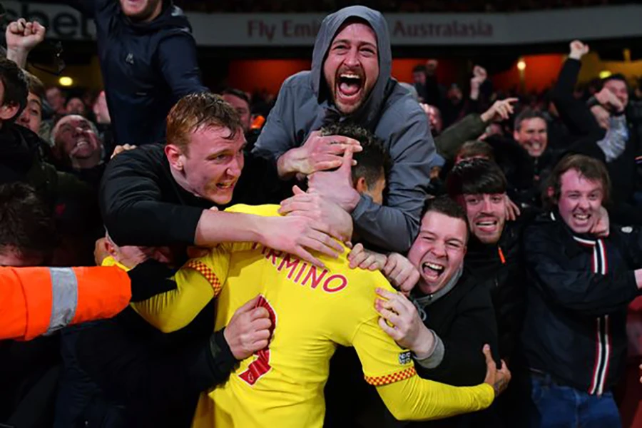 Firmino ăn mừng cùng các fan Liverpool và phải nhận thẻ vàng. ẢNH: GETTY