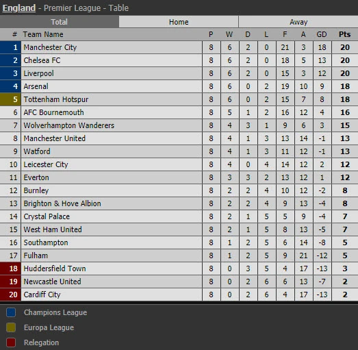 Sau tám vòng đấu Premier League, Man. City đứng đầu với hiệu số +18, Chelsea thứ hai hiệu số +13 còn Liverpool xếp thứ ba hiệu số +12. Hai đội đứng sau là Arsenal và Tottenham cũng chỉ thua ba đội đầu bảng 2 điểm. Điều này khiến cuộc đua xưng vương ở giải Ngoại hạng Anh trở nên hấp dẫn hơn bao giờ hết.