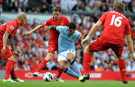 Man City lọt giữa trùng vây của Liverpool trên sân Alfield. Ảnh: AFP