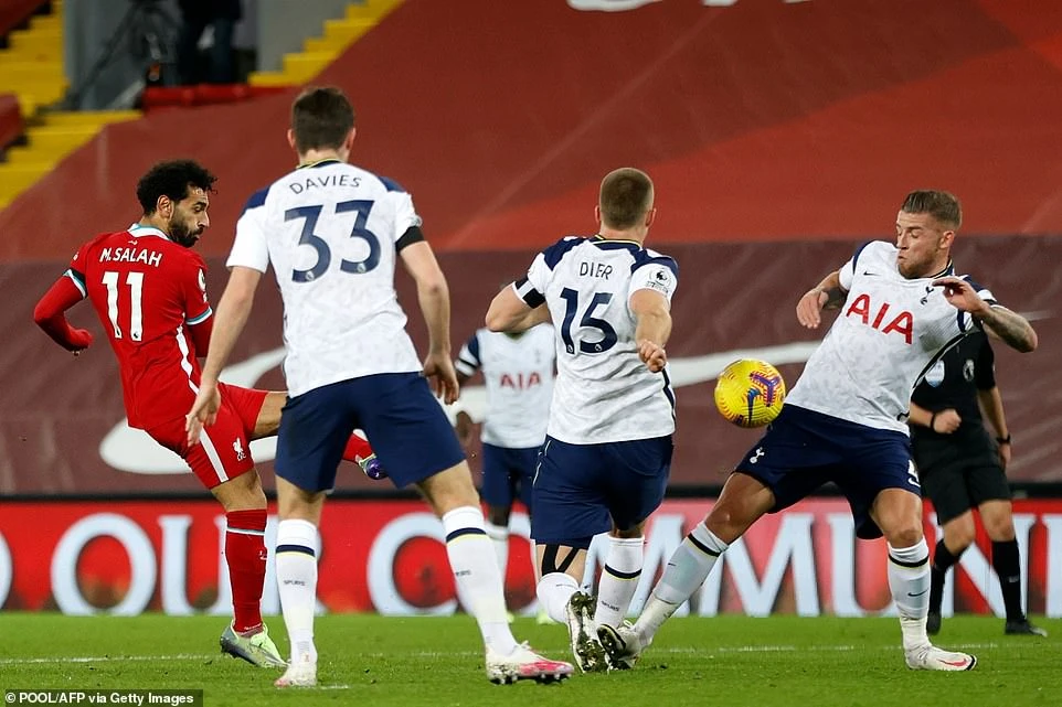 Sức ép nghẹt thở của Liverpool cuối cùng cũng tạo nên thành quả nhờ sự may mắn. Salah có pha dứt điểm chạm chân Alderweireld đổi hướng khiến Lloris chỉ biết đứng nhìn bóng cuộn vào mép trong cột dọc bay vào lưới. 1-0 cho chủ nhà Liverpool ở phút 26.