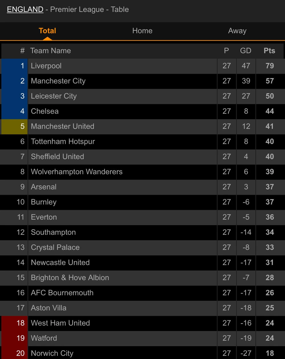 Giành chiến thắng kịch tính với tỉ số 3-2 trên sân nhà, Liverpool tiếp tục xây chắc ngôi đầu bảng với 79 sau 27 vòng đấu. “Lữ Đoàn Đỏ” tiếp tục giữ được khoảng cách vô cùng lớn với đội xếp sau là Man. City khi hơn nhà ĐKVĐ đến 22 điểm.