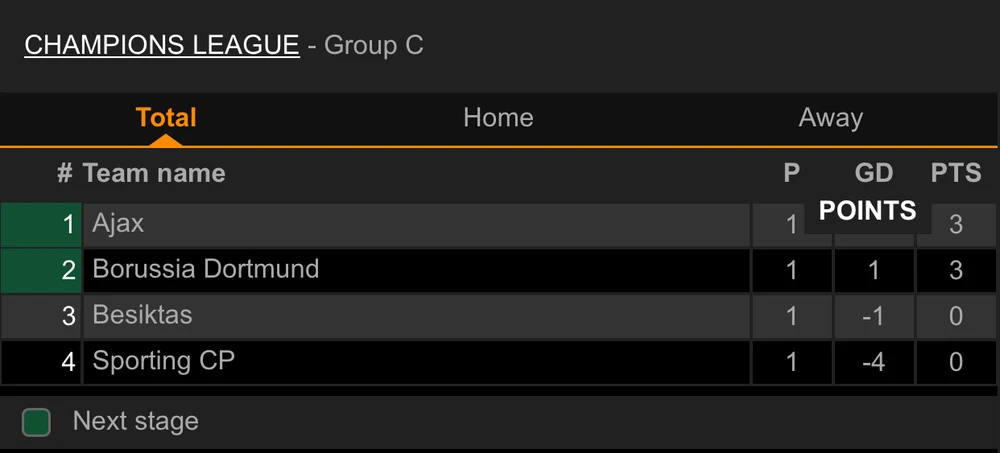 Tại bảng C, Ajax lên đầu bảng khi đánh bại chủ nhà Sporting với tỷ số 5-1, Borussia Dortmund chiếm vị trí nhì bảng khi thắng Besiktas 2-1.