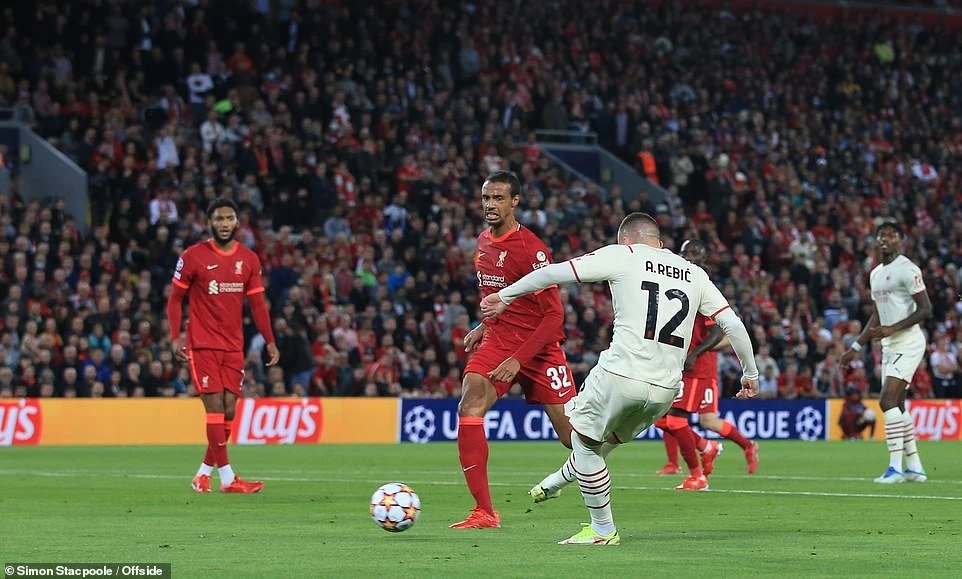 Năm phút cuối hiệp một, AC Milan gây bất ngờ khi có được 2 bàn thắng liên tiếp để kết thúc hiệp một với lợi thế dẫn trước 2-1. Trung phong Ante Rebic là người gỡ hòa cho AC Milan ở phút 42 khi tận dụng đường chọc khe của Rafael Leao để tung cú sút vào góc xa đánh bại thủ môn Alisson. Đến phút 44, tiền vệ Brahim Diaz có pha đệm bóng cận thành để kịp đưa AC Milan vươn lên dẫn 2-1 trước khi bước vào giờ nghỉ giữa hiệp.