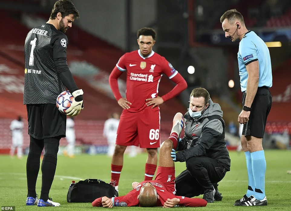 Fabinho rời sân vì chấn thương. ẢNH: EPA