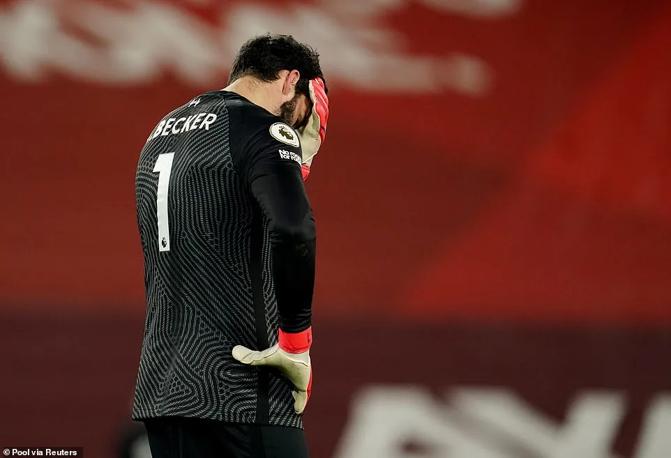 Alisson thất vọng với những sai lầm của mình. ẢNH: REUTERS