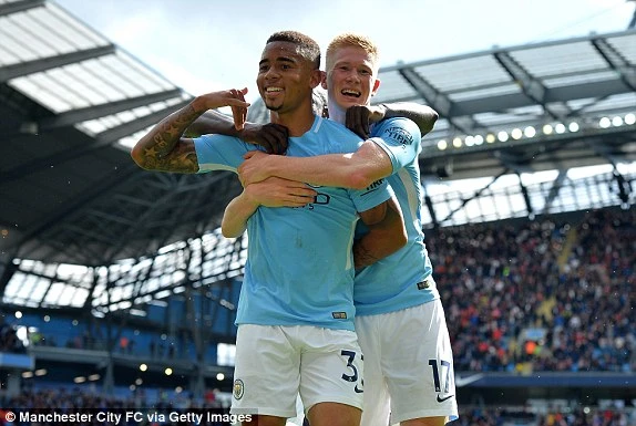 Phút 45+6, De Bruyne có pha tạt bóng vào như đặt cho Jesus đánh đầu cận thành tung lưới Mignolet nâng tỉ số lên 2-0 cho Man City. Hiệp 1 kết thúc với lợi thế 2 bàn cùng việc thi đấu hơn một người dành cho chủ nhà Man City.