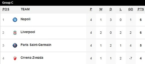 Với kết quả thua bất ngờ 0-2 trước Crvena Zvezda, thầy trò HLV Jurgen Kloop đã tự tước bỏ đi cơ hội giành được chiếc vé sớm vào vòng trong. Với hai trận thắng và hai trận thua sau bốn lượt trận, Liverpool mất vị trí đầu bảng C vào tay Napoli mặc dù cả hai đội có cùng điểm số nhưng đại diện nước Ý xếp trên nhờ hơn Liverpool hiệu số bàn thắng.