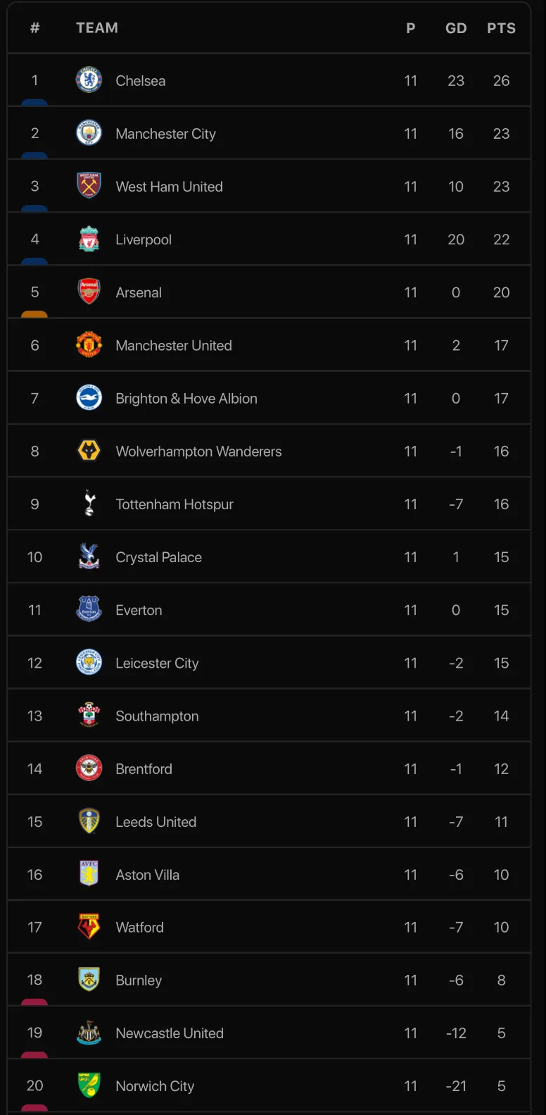 Cùng vòng đấu, Arsenal có chiến thắng với tỷ số 1-0 trước Watford với pha làm bàn do công của Smith-Rowe ở phút 56. Chiến thắng này giúp “pháo thủ” có được 20 điểm sau 11 vòng đấu và vượt mặt MU để vươn lên vị trí thứ 5.
