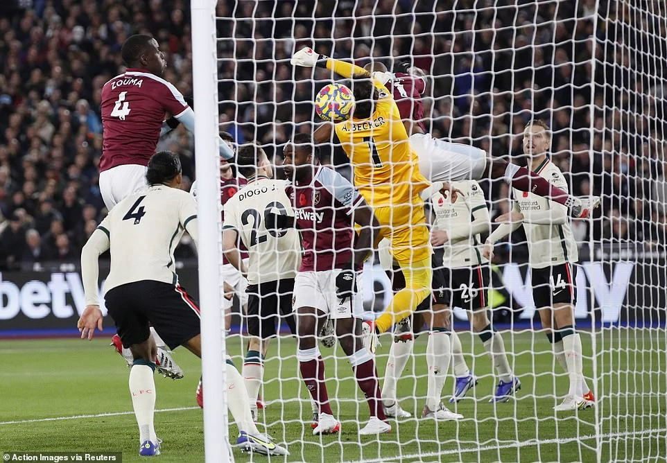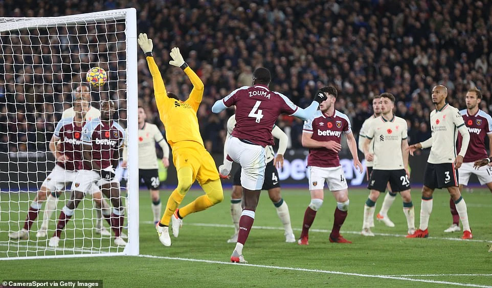 Pha bóng chạm tay thủ môn Alisson mang về bàn thắng mở điểm cho West Ham ở phút thứ 4. Ảnh: Reuters.