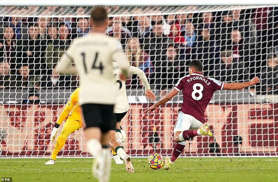 Đầu hiệp hai, West Ham tiếp tục tạo sóng gió lên khung thành của Liverpool từ tình huống cố định, khi ở phút 50 Declan Rice bật cao đánh đầu đưa bóng chạm xà ngang khung thành đối thủ. Đến phút 67, West Ham tiếp tục thế dẫn bàn khi Pablo Fornals khi bàn nâng tỷ số lên 2-1. Từ tình huống phản công, Jarrod Bowen đi bóng qua hàng loạt cầu thủ Liverpool trước khi chọc khe cho Pablo Fornals dứt điểm trước vòng cấm ghi bàn.