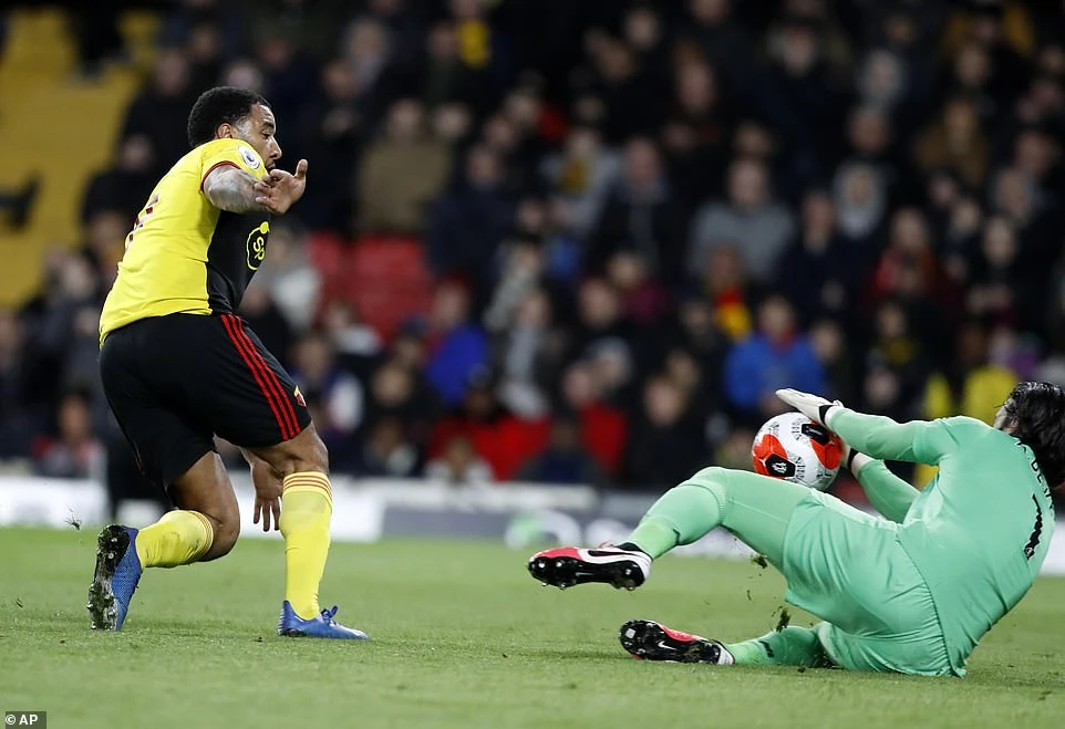 Phút cuối hiệp một, mành lưới của Liverpool suýt phải rung lên sau màn khuấy đảo của tiền đạo Troy Deeney. Đón đường đánh đầu kiến tạo của đồng đội, Deeney một mình băng xuống đối mặt thủ môn Alisson, số 9 của Watford tung ra hai pha dứt điểm liên tiếp nhưng không thành bàn. Bởi ở cú sút đầu tiên, thủ môn Alisson đã cản phá thành công, còn ở pha dứt điểm thứ hai Deeney lại lốp bóng đi ra ngoài.