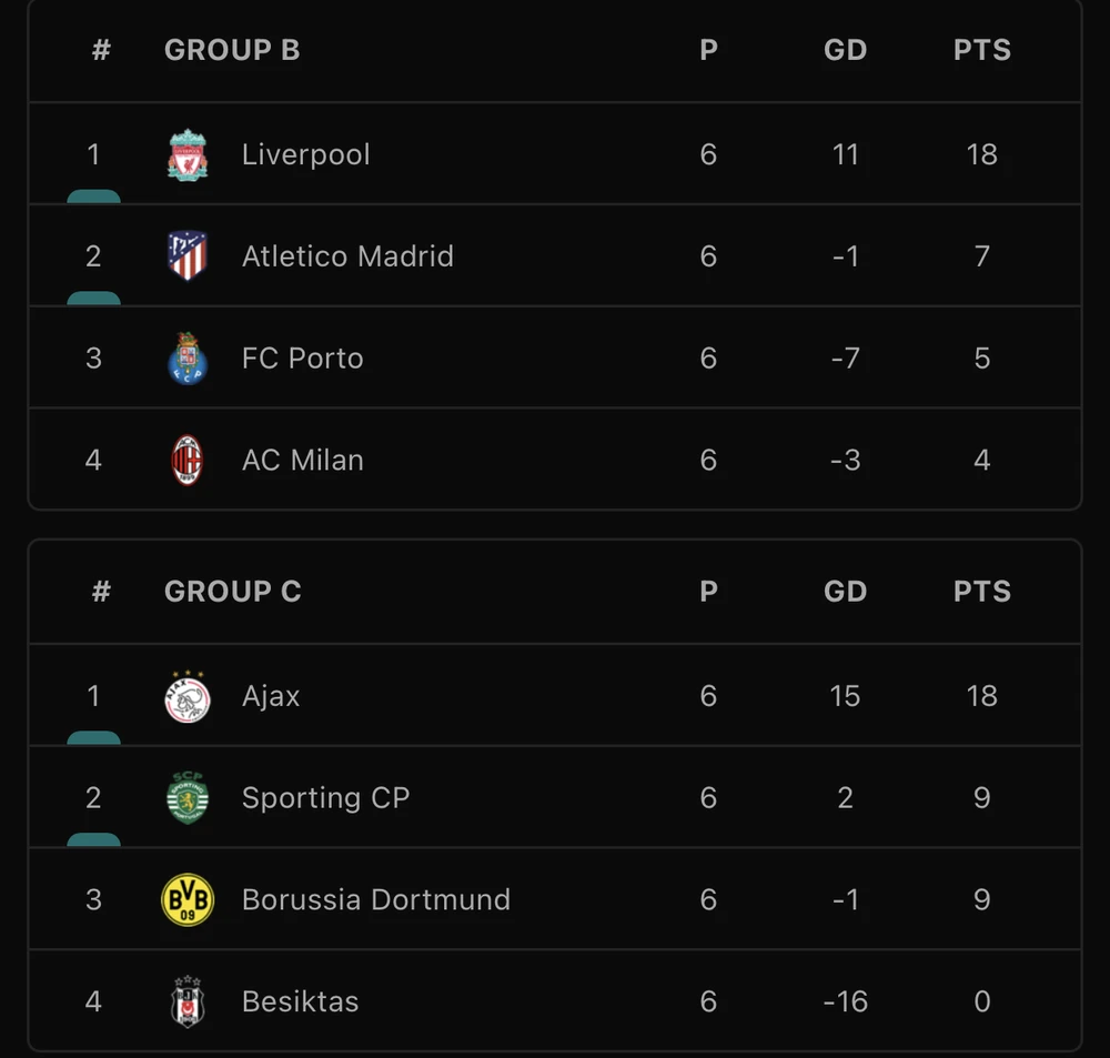 Tại bảng C, Ajax thắng Sporting với tỷ số 4-2 và Dortmund “hủy diệt” Besiktas với tỷ số 5-0. Ajax đi tiếp vào vòng 16 đội với 18 điểm sau 6 trận toàn thắng, Sporting và Dortmund có cùng 9 điểm, nhưng Sprorting đứng nhì bảng và Dortmund phải xuống chơi Europa League.