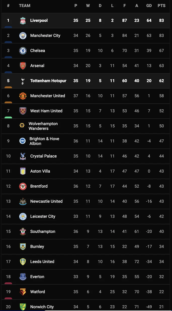 Với 2 trận còn lại trong tay, cơ hội để Liverpool vượt mặt Man City vô địch Premier League là rất mong manh. Trong khi đó, Tottenham cũng rơi vào tình trạng tương tự trong cuộc đua giành vé dự Champions League với Arsenal. Tottenham hiện xếp thứ 5 Premier League với 62 điểm, kém vị trí thứ tư của Arsenal 1 điểm nhưng lại thi đấu nhiều hơn 1 trận.