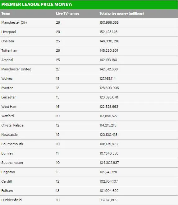 Trong 20 CLB Premier League, chỉ có duy nhất Huddersfield kiếm được dưới 100 triệu bảng, 19 CLB còn lại “bỏ túi” từ 101 triệu bảng trở lên. Mỗi CLB có trận đấu được trực tiếp sẽ nhận một khoản cứng 12,5 triệu bảng Anh, ngoài ra, các CLB có thể nhận thêm 1,2 triệu bảng Anh tùy thuộc vào những điều kiện khác.