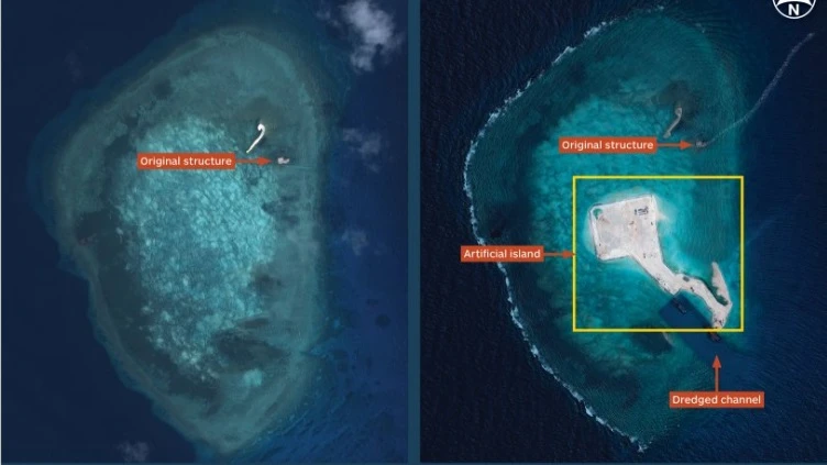 Tuy nhiên, ảnh chụp vệ tinh của trung tâm Quốc phòng và Vũ trụ Airbus chụp vào ngày 31-3 và 7-8 cho thấy, một hòn đảo đã bất ngờ mọc lên với kích thước từ 300m đến 250m. Diện tích dất nhân tạo mới xây được xác định vào khoảng 114.000 m2.