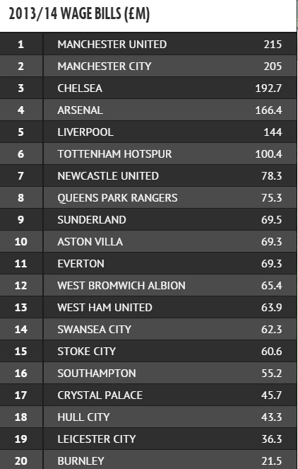 Theo công bố của Mirror thì M.U là đội bóng phải chi trả tổng lương cao nhất Premier League mùa 2013/14. Cụ thể, Quỷ đỏ phải trả cho các ngôi sao của mình tổng lương là 215 triệu bảng.