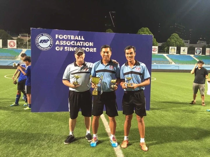 HLV Hứa Hiền Vinh và trợ lý Phước Tứ cùng trợ lý ngoại của lò PVF hạnh phúc với chiếc cúp của đội U-15.