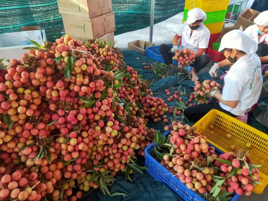Sơ chế vải thiều trước khi xuất khẩu. Ảnh:V.A